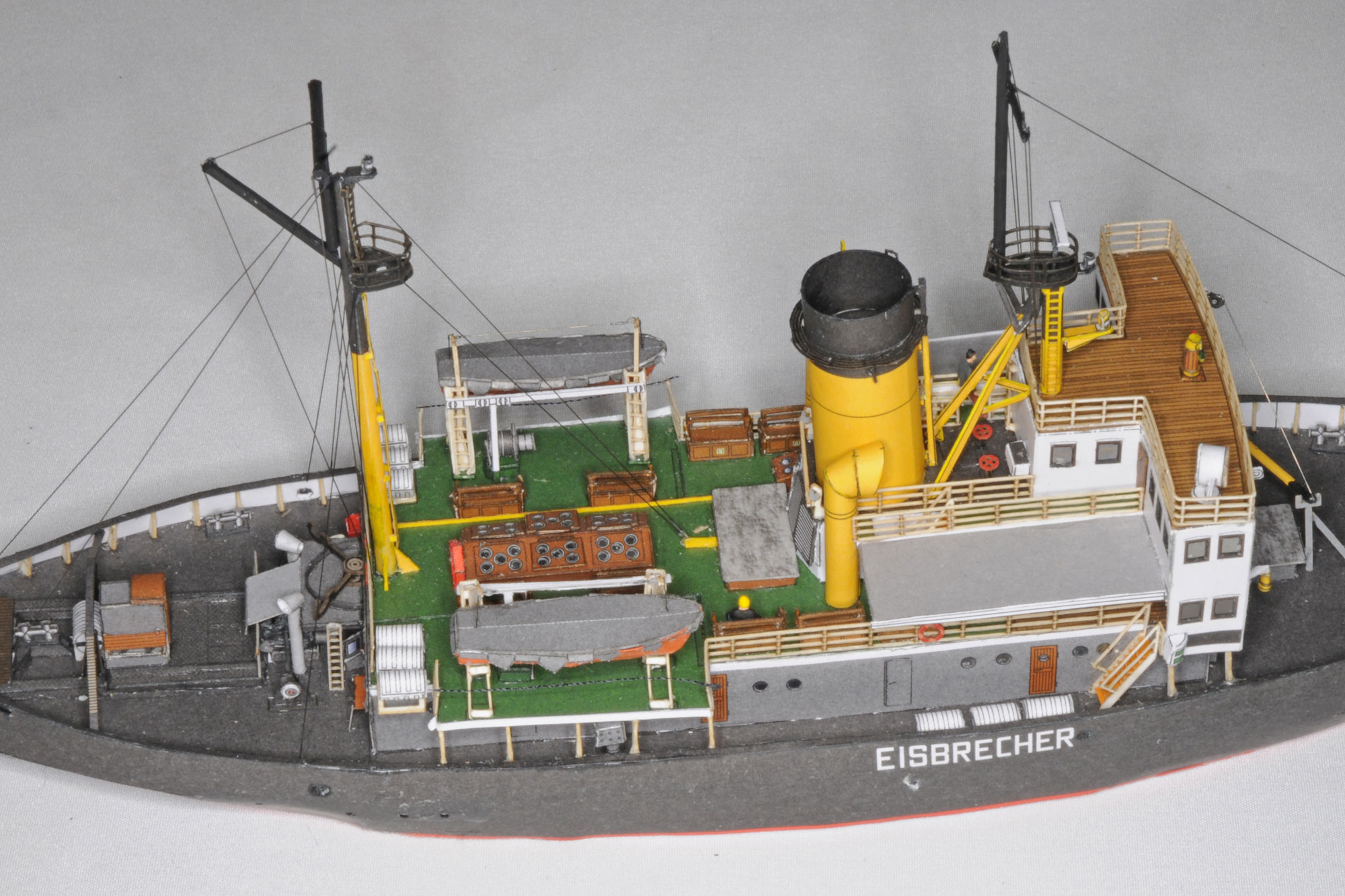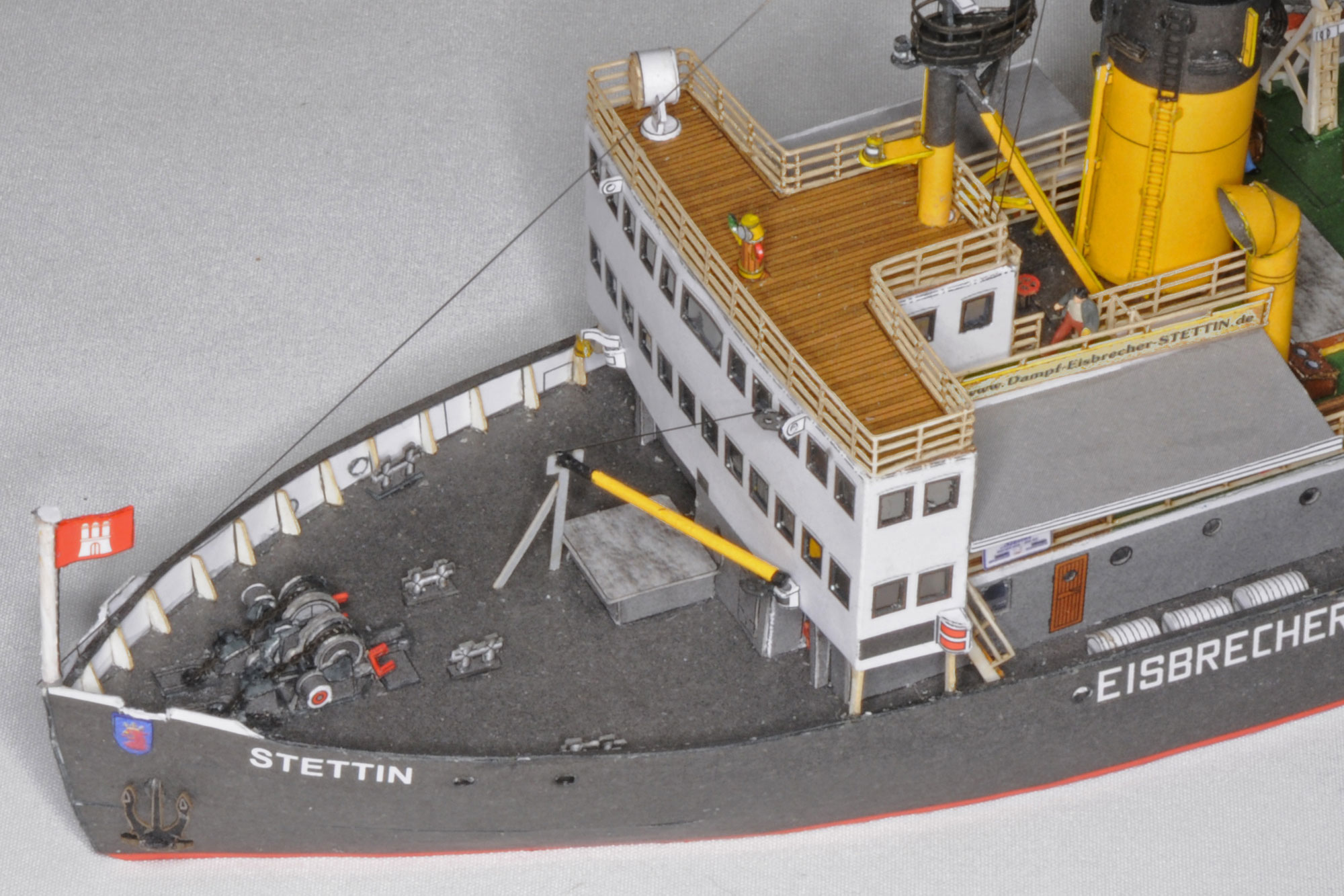 Unser Modell zeigt die Stettin im heutigen Zustand als Museums- und Gästeschiff. Die Bänke (Baugruppe 82) sind beweglich und werden je nach Bedarf an Deck verteilt. An besonders sonnigen und heißen Tagen werden die Markisen (Baugruppe 83) ausgefahren. Informationen und Fahrpläne sind zu finden auf www.dampf-eisbrecher-stettin.de oder direkt bei der Geschäftsstelle in Hamburg: 040 / 56 19 49 50. Der Liegeplatz der Stettin befindet sich zur Zeit beim Museumshafen Oevelgönne in Hamburg.