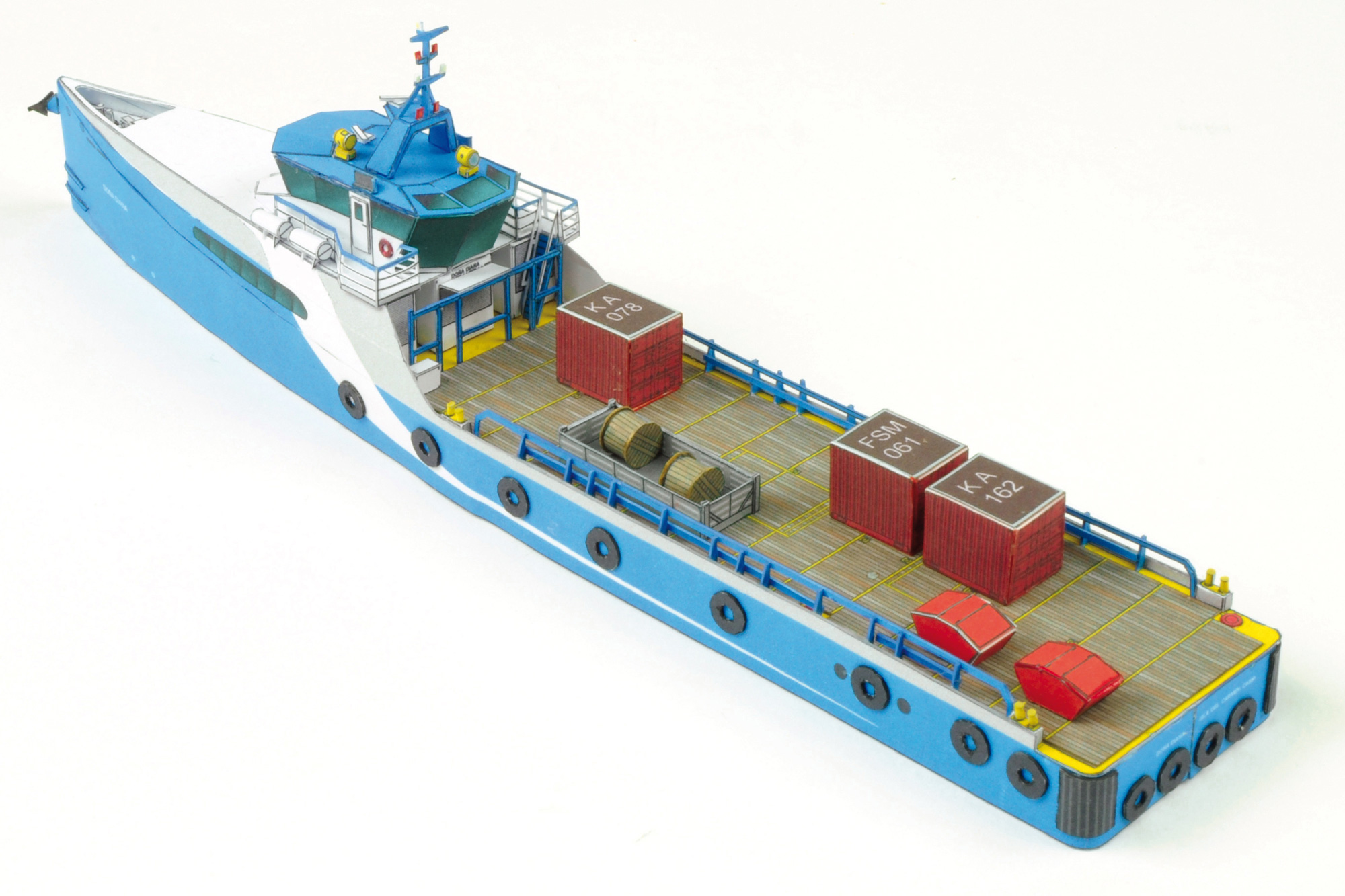 Der gelungene Modellbogen von Till Schade zeigt einen typischen Vertreter eines Axe-Bow Schiffs. Dieser ungewöhnliche Schiffstyp ist im Modellbau bislang eher selten anzutreffen. Der auffällige blaue Rumpf macht das Modell zu einem schönen Farbtupfer in jeder Schiffsmodellsammlung.